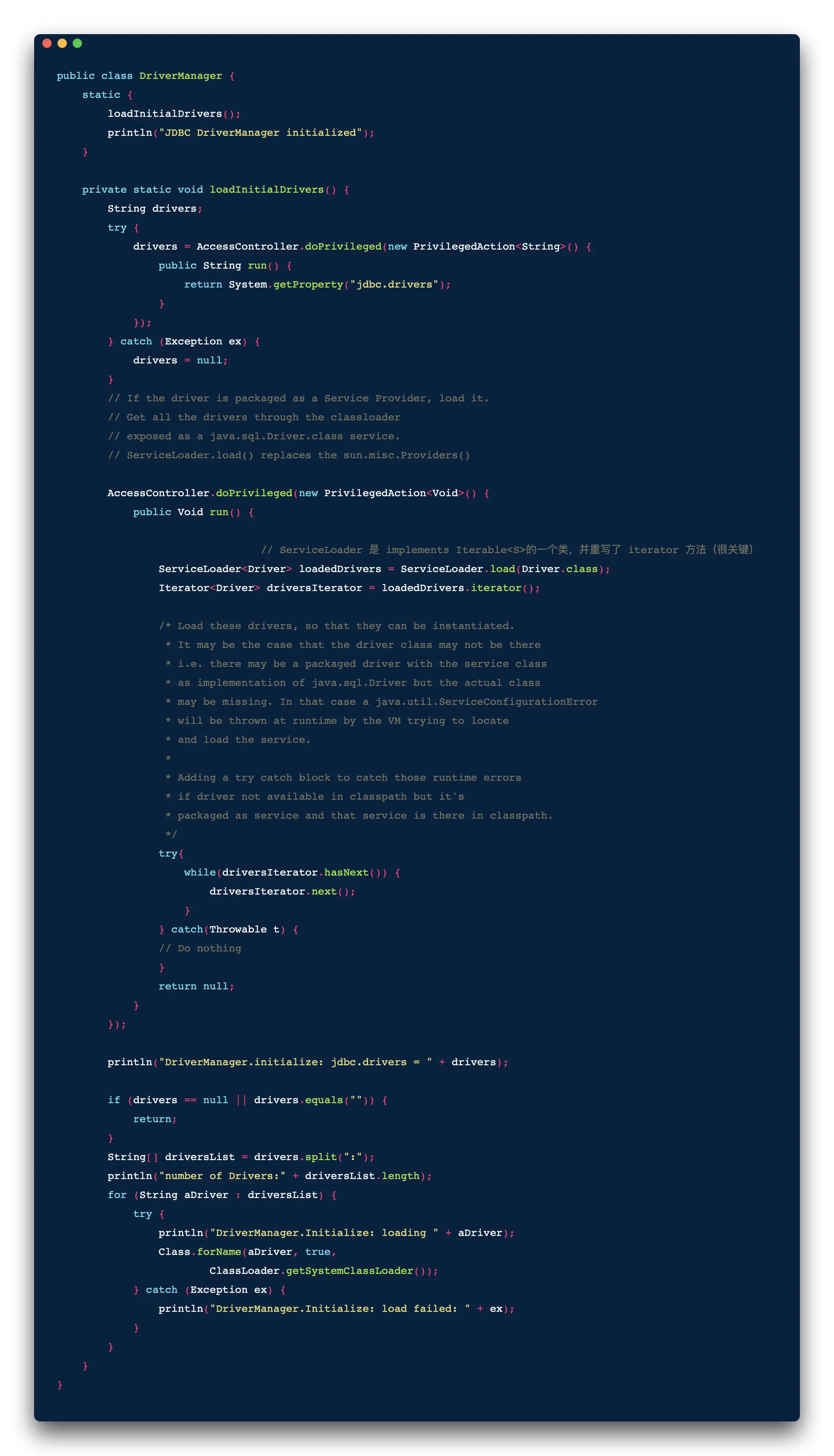 现在我们看下DriverManager是如何使用线程上下文类加载器去加载第三方jar包中的Driver类的,先来看源码: