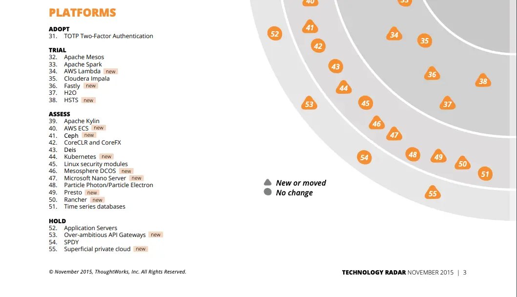 从它们在技术雷达所处的位置,就可以看出其发展趋势,它们都于 2015 年 11 月进入 “评估” 区域。