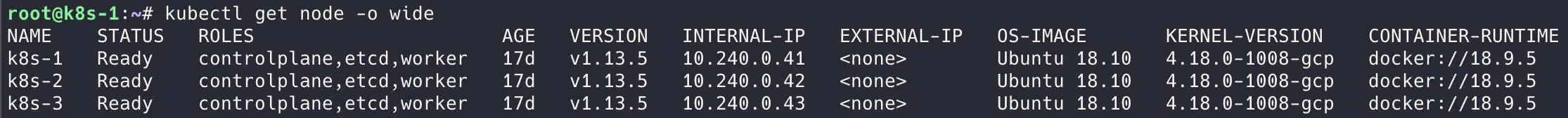 k8s-3 Ready controlplane,etcd,worker 34d v1.13.5 <IP> <none> Ubuntu 18.10 4.18.0-1011-gcp docker://18.9.5这列出了在每个节点上运行的核心软件的状态、角色、连接信息和版本号。如果需要在集群节点上执行维护或登录以调试问题,此命令可以帮助您提供所需的信息。