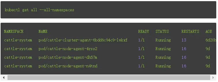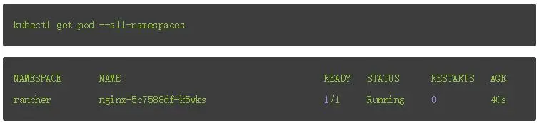 这将显示在每个命名空间中运行的pod,并另外添加一个NAMESPACE列,列出每个资源部署到了哪个命名空间。在这里,我们看到Nginx pod已正确部署到我们的rancher命名空间而不是通常的default命名空间。