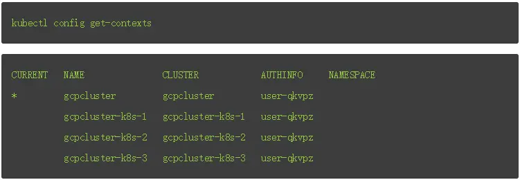 输出的内容显示了每个已定义上下文的详细信息以及当前选定的上下文,由星号(*)表示。