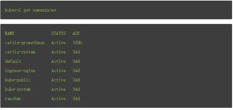 要概述集群中可用的命名空间,请使用get namespaces命令: