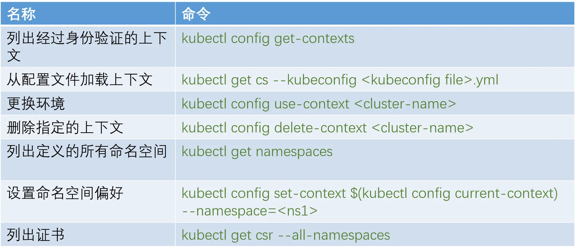 - 使用kubeconfig文件组织集群:https://kubernetes.io/docs/concepts/configuration/organize-cluster-access-kubeconfig/