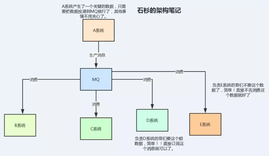 这种情况下使用MQ来解耦是在合适不过了,因为负责A系统的哥们只需要把消息扔到MQ就行了,其他系统按需来订阅消息就好了。