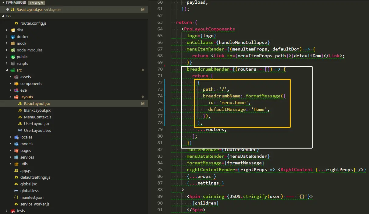 接着我在 layouts/BasicLayout.tsx 文件中发现了有关于面包屑的一些设置:
