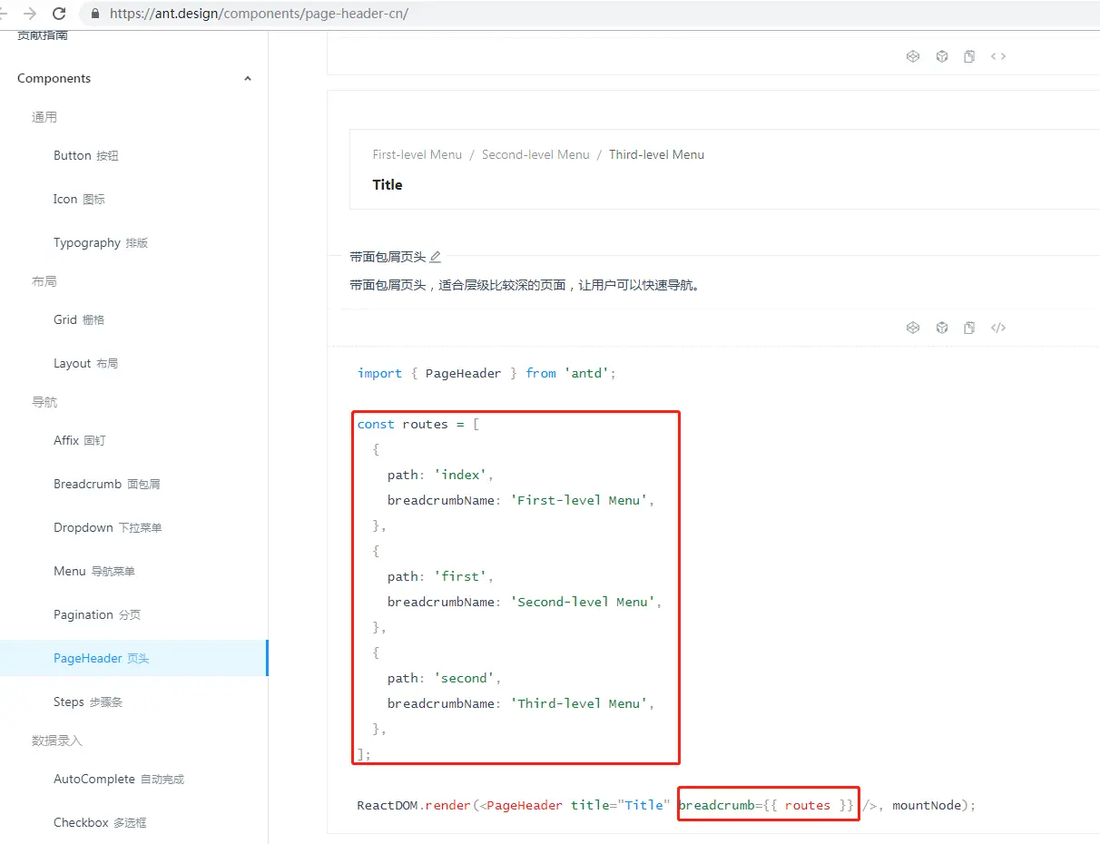 这是官方文档的描述,即如果要用内置的面包屑,则需要用到 PageHeaderWrapper 组件: