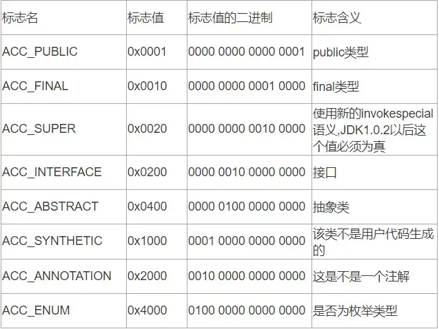 常量池过后是访问标志,该标志用于识别一些类或接口层次的访问信息。