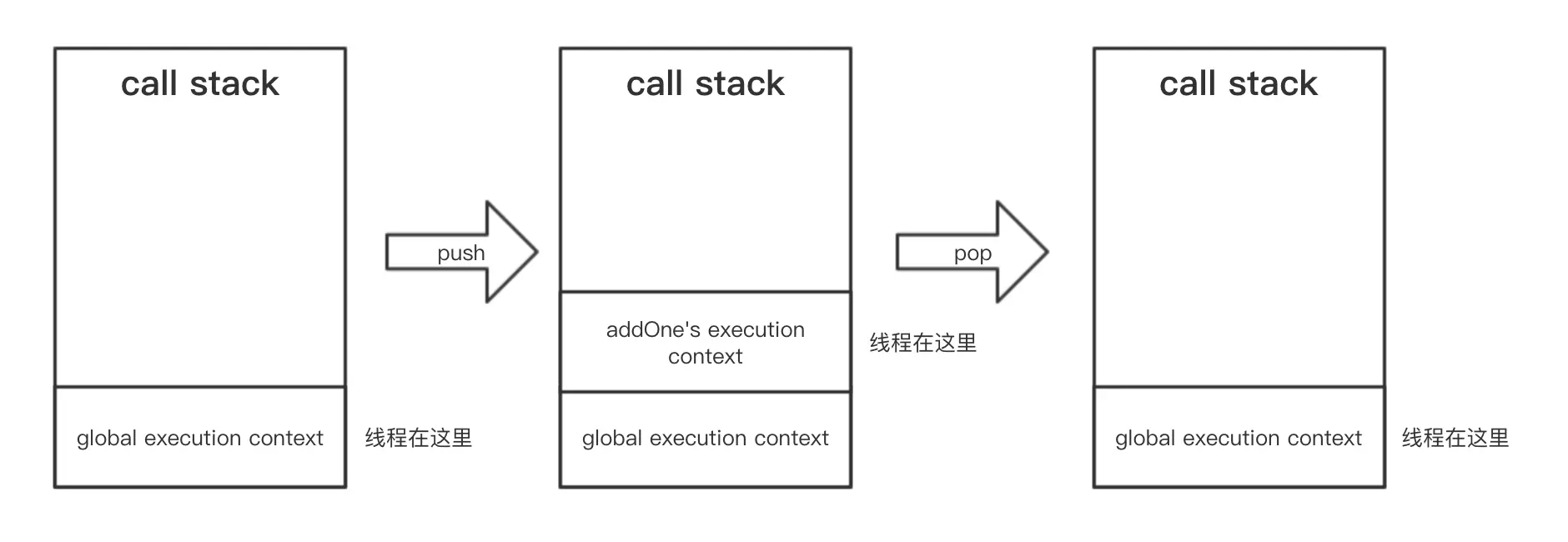 addOne,call stack立刻将addOne的上下文push进去,待执行到return标识后,再pop出来: