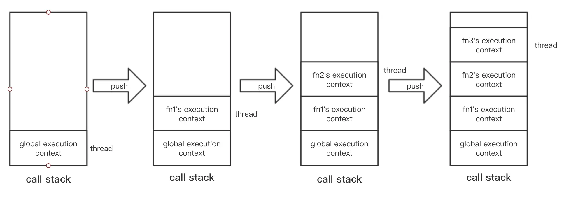 而call stack就是一种数据结构,用于“存储”上下文,通过不断推入push、推出pop上下文的方式,跟踪线程目前所处的环境——线程无需刻意记住自己身处何方,只要永远处于最顶层执行上下文,就是当前函数执行的正确位置