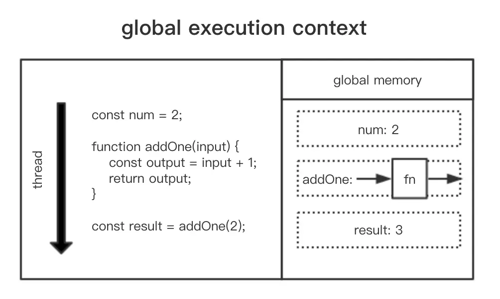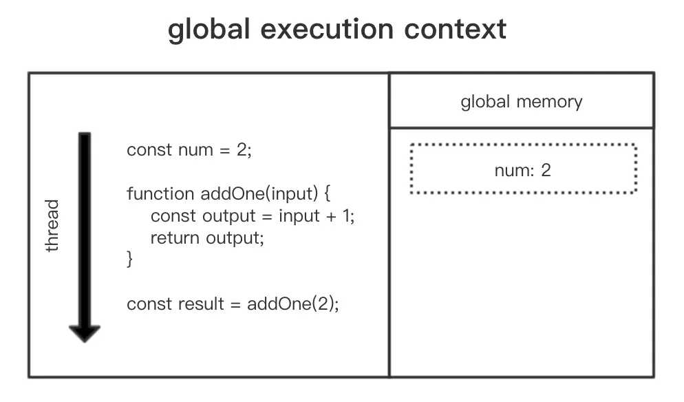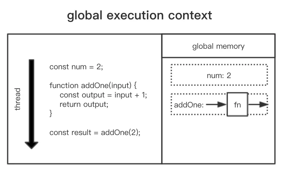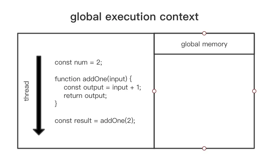 thread的执行顺序,众所周知 js 是单线程的,它会一行行、从上往下去执行代码;而右边的global memory,它用于存储当前上下文中的数据,由于线程目前处于全局上下文环境,故加了个global的前缀。