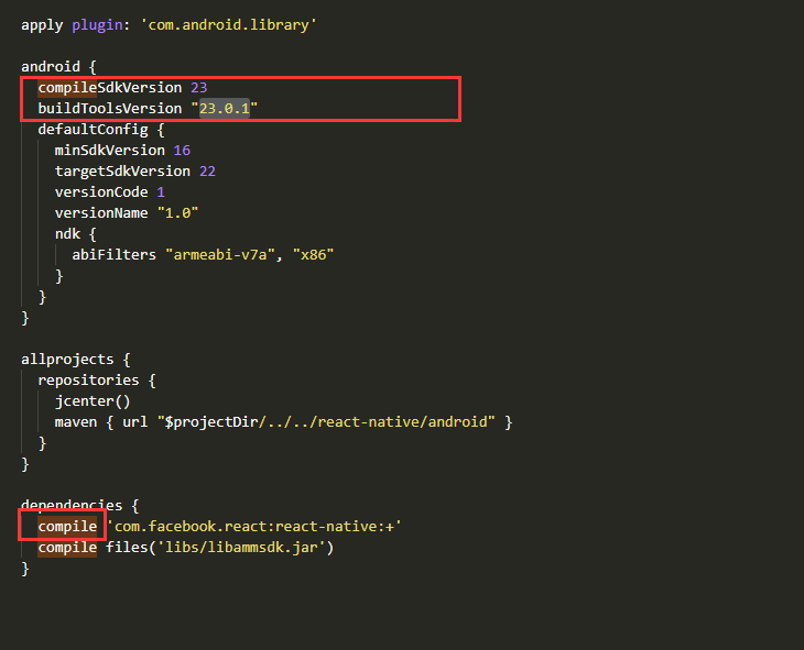 这个时候需要找到文件: node_modules / react-native-wechat / android / build.gradle 并打开,