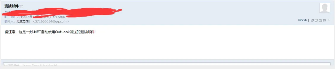 MailHelper.SendMail("xxxx@qq.com", "测试邮件", "请注意,这是一封.NET自动使用OutLook发送的测试邮件!");