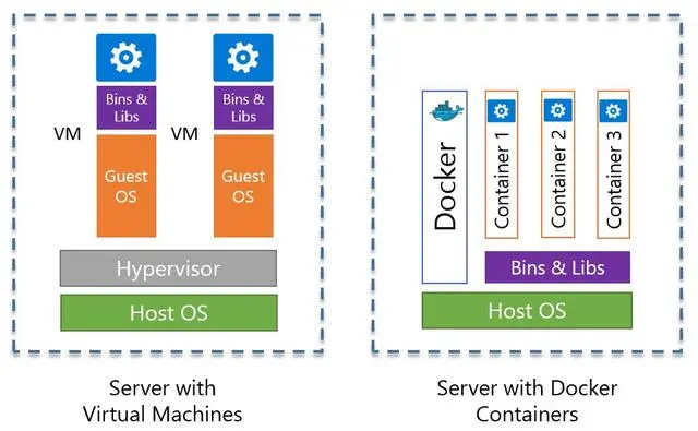 容器到底是什么呢?也许对于容器不太了解,但我们对虚拟机熟悉啊,那么我们就先来看一下容器与虚拟机的对比区别:
