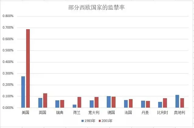 再来对比一下其它西方国家。下图是各国从1983到2001年监禁率的变化图。