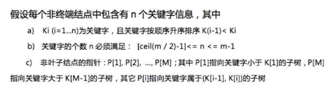 除了根节点和叶子节点外,其他每个节点至少有ceil(m/2)个孩子