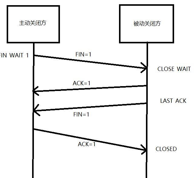 4.主动关闭方接收到Fin后,进入TIME_WAIT状态,给对方发送ACK,序号为收到序号+1,被动方进入CLOSED状态。