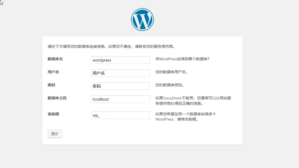 依次填写数据库名称、数据库用户名、数据库密码、数据库主机(相关信息可以从你的主机面板上获取),填写完成之后点击提交,得到以下界面: