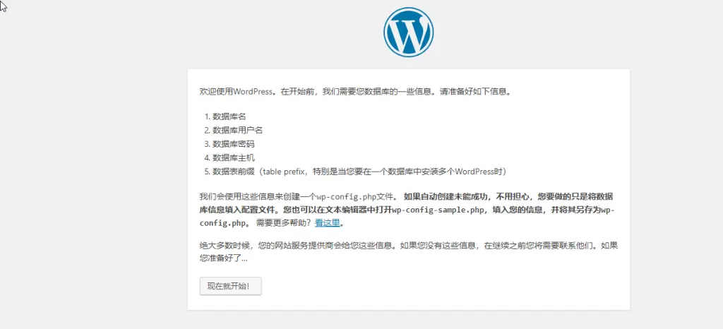 然后将WP源文件一个一个上传至网站根目录,上传成功之后解析域名(至于如何解析域名,大家可以百度),然后访问域名得到安装界面: