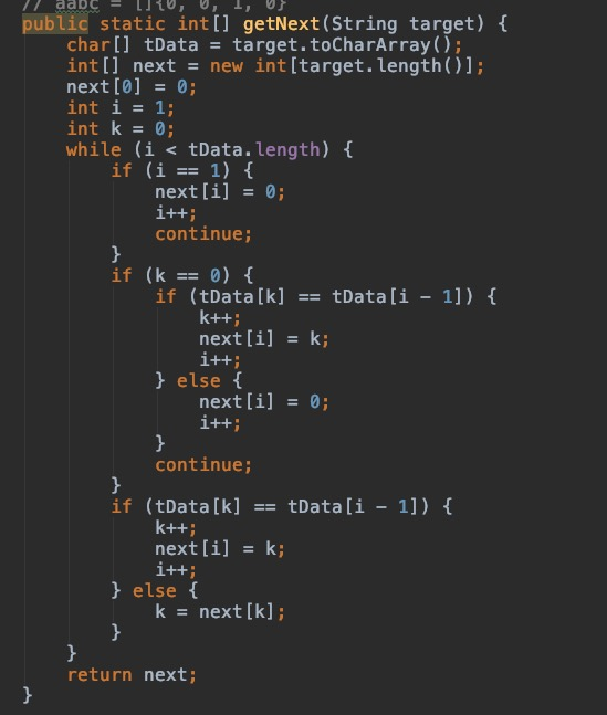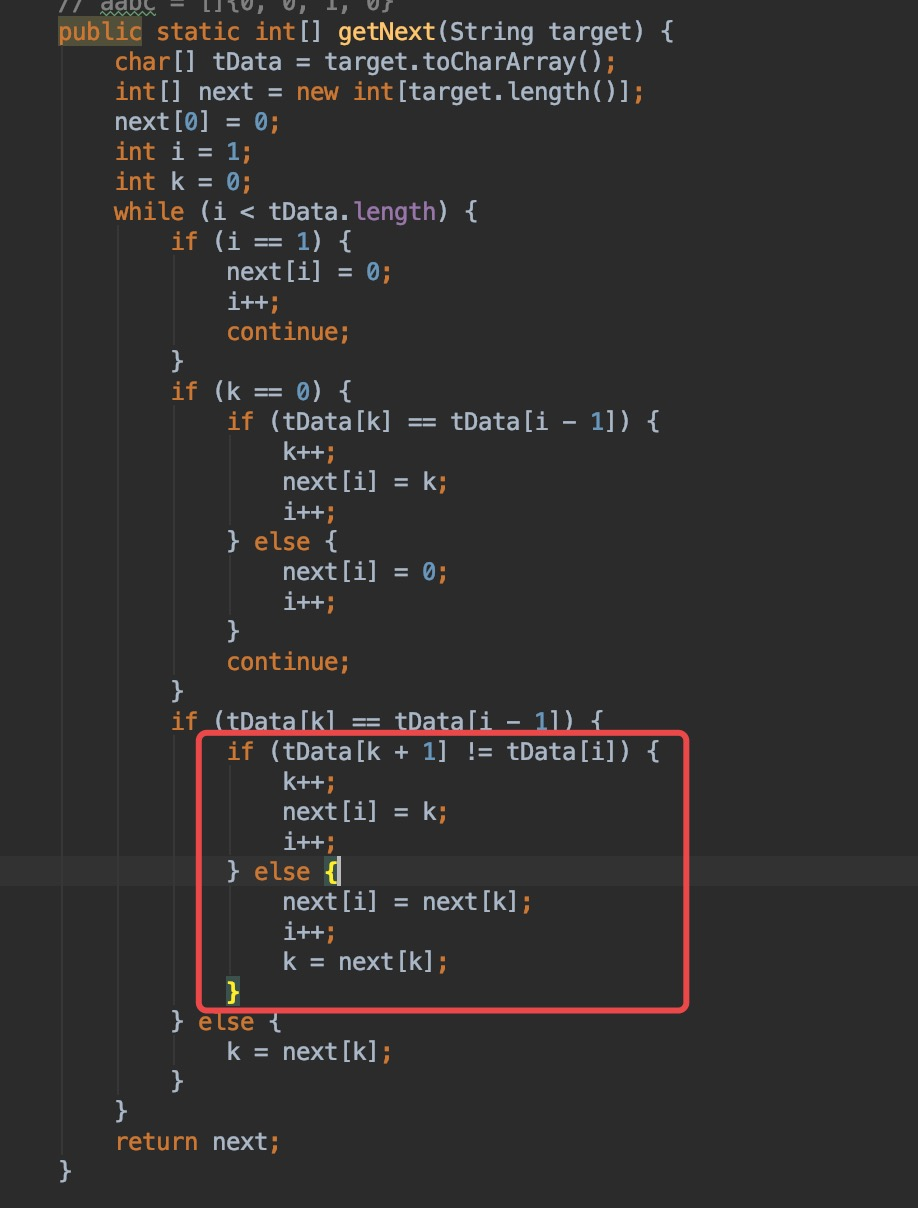 那么进入下次的循环过程中t[0]、t[1]、t[2]...t[k-1]会依次落在上次t[n-k],t[n-k+1]...t[n-1]的位置。同时t[0] = s[i-k]、t[1] = s[i-k+1] ... t[k-1] = s[i-1], t[k]会落在上一次t[n]的位置和s[i]进行比对,由上面分析可知,s[k] != t[i],所以这次比对注定是失败的,这是不是就是我们可以优化的地方,且看next[]求值优化后的代码。