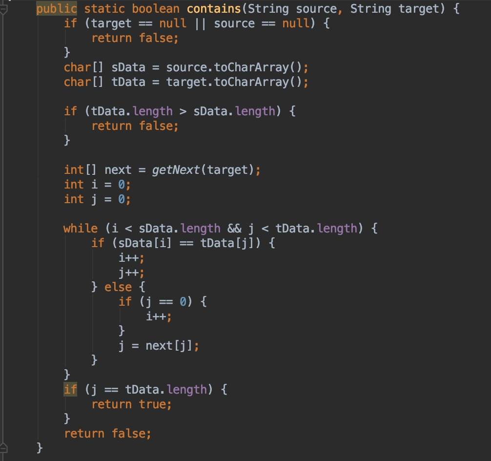 跳过前面条件判断的部分,到达for循环,大致意思就是从 source 的第0个位置开始和 target 的第0个位置进行匹配(之后把 source 简称为 s , target 简称为 t),如果两个位置的字符相等则取 s 和 t 各自加 1 位置的直到 t 的循环结束返回出,在此过程中,如果 s 和 t 相关位置上的字符不想等则跳出循环,然后s的起始位置加 1,t的起始位置变为0,进行循环往复的匹配逻辑,直到最后返回flase。
