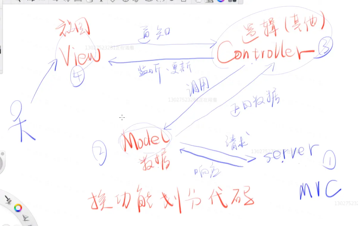 controller监听view,当用户点击了view,controller就调用model,model向server发请求,server返回响应给model,model把数据返回给controller,controller更新view。