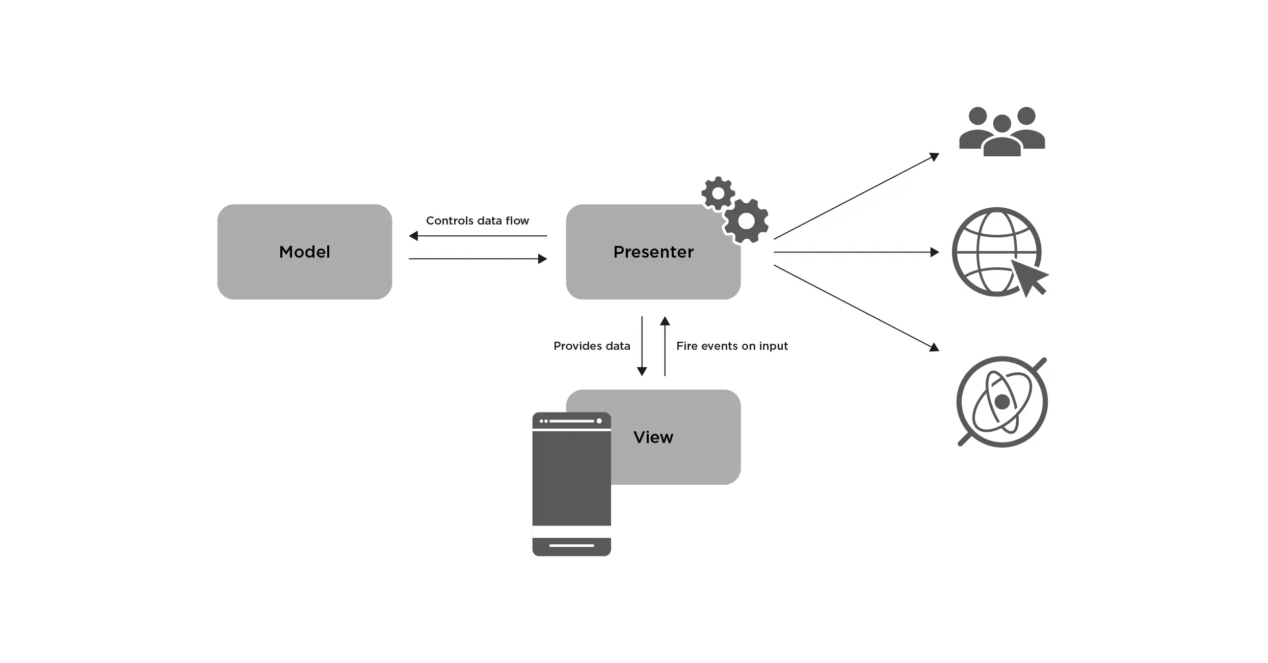 第一种方法显然是不能工作的。我们尝试过的第一件事情是 MVP,或者说 model-view-presenter。每个人都熟悉 MVP。它是最受欢迎的架构模式之一。看起来像这样: