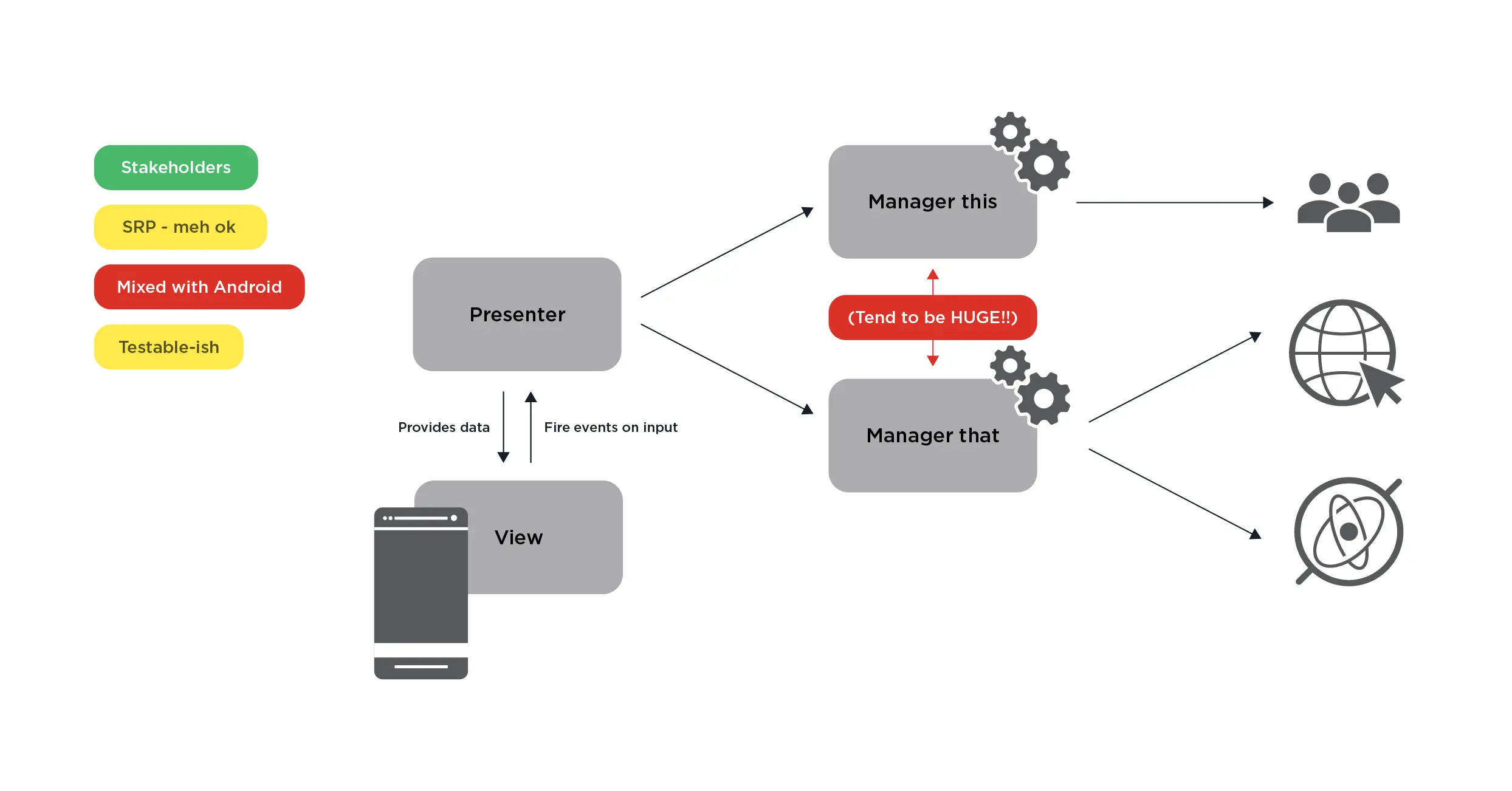说实话,这甚至有点凑效。业务逻辑包含在 Manager 中。利益相关者知道往哪看,关注点一定程度是分离的但可以做得更好,你可以编写更多的测试,但你依然直接触摸 Android ,所以你必须编写 Android 测试用例,并预先填写数据库来测试业务逻辑,一个字:不爽。是的,Manager 有变成巨兽的倾向,很快就变得难以维护。你可能争论说它不会变得更复杂,你可以通过更简单的架构来更快地提供代码,但通过这种方法依然会有很多 BUG,可维护性也会遭到破坏。