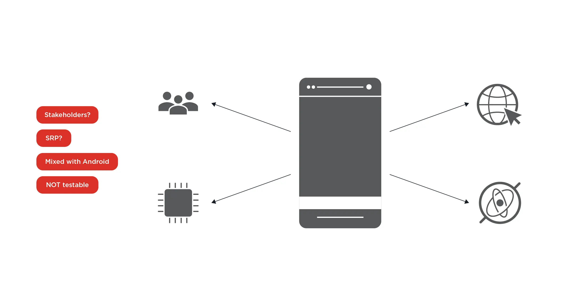 我们有一个 Activity 操作数据库,访问网络,解析数据,切换线程以及渲染数据。所有的利益相关者都在看这一个类,没有关注点是分离的,它是不可测试的,业务逻辑和 Android 的东西混杂在一起。