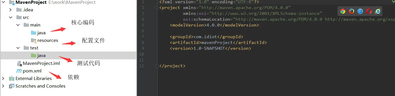 在这里有必要提一下Maven的思想:约定>配置>编码。简单来说Maven自动化构建已经约定好了每个路径下存放的编码类型,虽然你可以通过配置路径去改变,但还是提倡按照Maven自动化构建的约定来使用Maven.