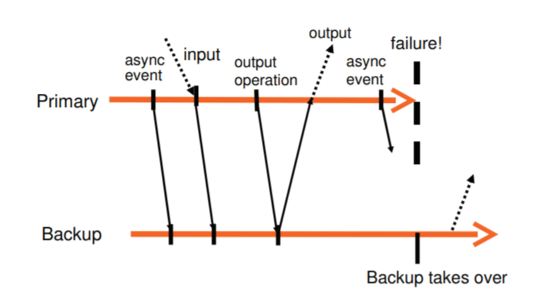 容错协议如下图所示,异步事件、输入和输出操作发送给了备份虚拟机,主虚拟机只有在备份虚拟机确认收到输出操作后输出。