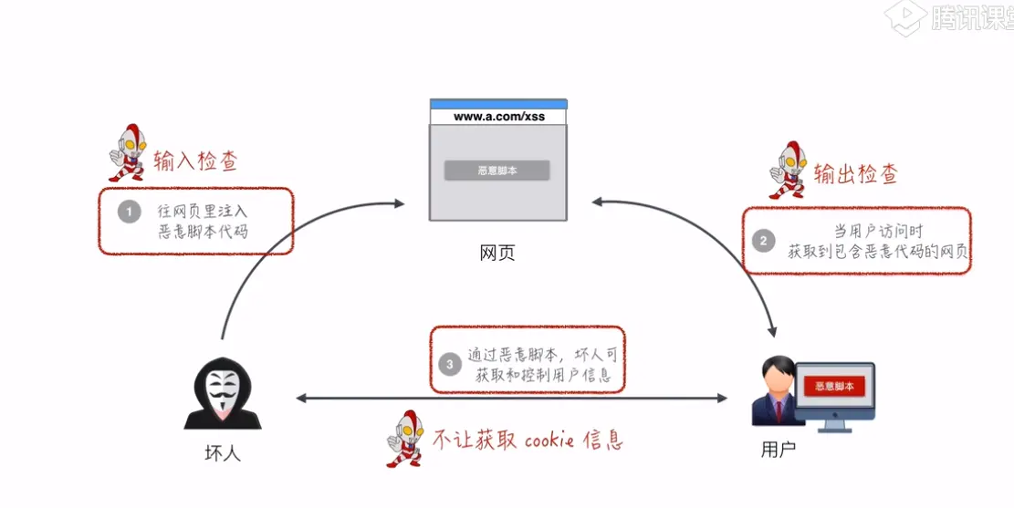 - 通过恶意脚本,坏人可获取和控制用户信息