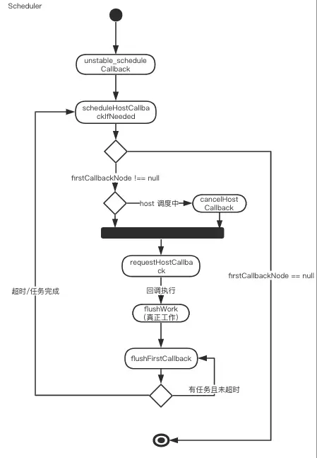 每一个调度流程,都由 scheduleCallback 函数为入口,经由检查器 scheduleHostCallbackIfNeeded 将任务标记为调度状态,在 flushWork 中循环调用执行任务,最后在任务执行完毕 firstCallbackNode 为空时,由 scheduleHostCallbackIfNeeded 函数确认任务执行完毕,结束该调度流程。