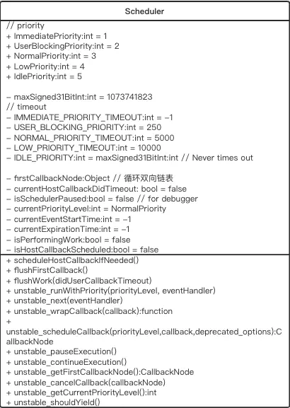 React 调度算法的源码位于 packages/scheduler/src/Scheduler.js 文件。在阅读源码之前,为了让大家对于该算法有一个整体的认识,笔者制作了如下类图: