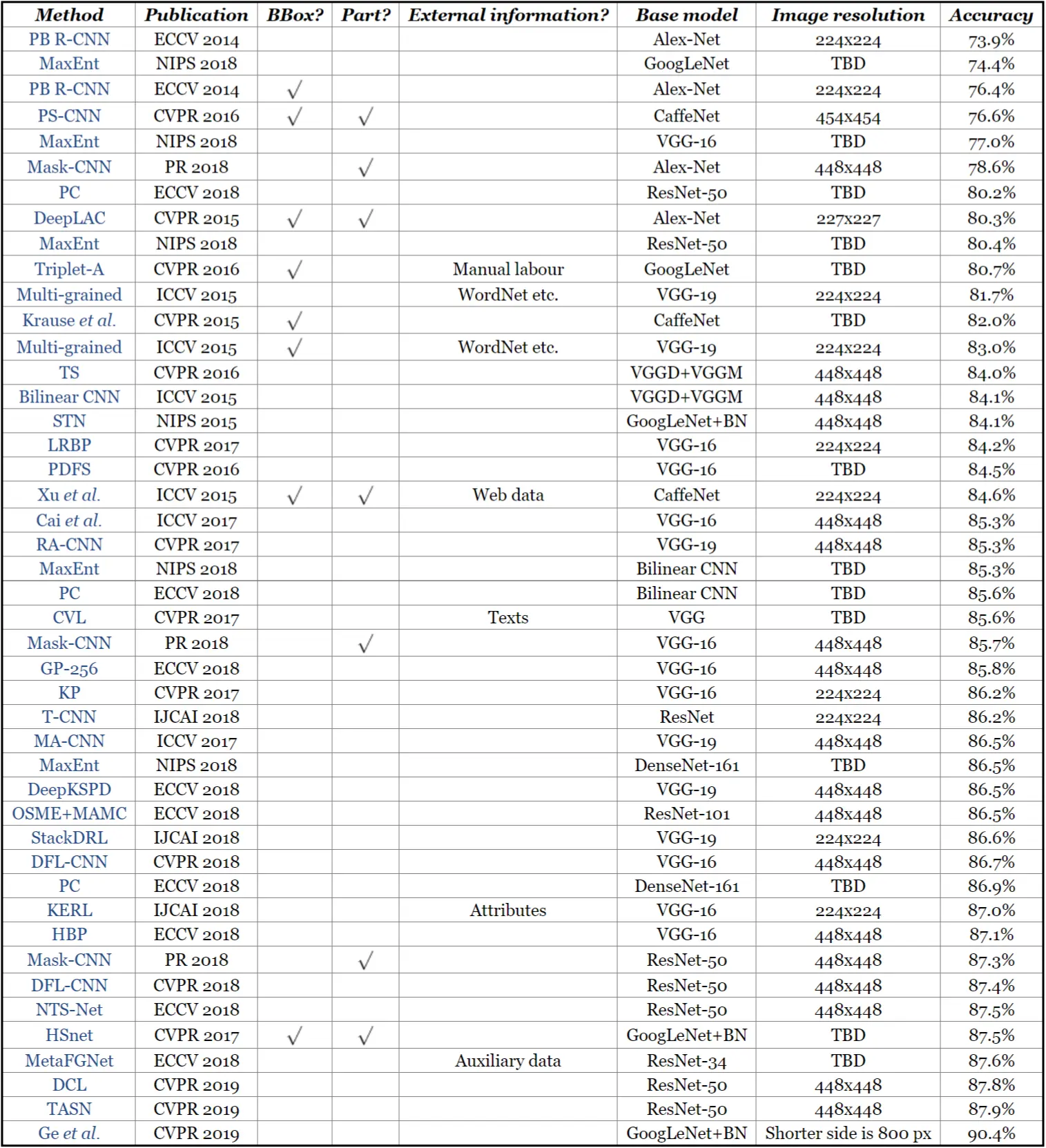 这里主要是在数据集 CUB200-2011 数据集上的测试准确率,列举出目前最好的方法和其是否采用标准信息、额外的数据、采用的网络结构、输入图片的大小设置以及分类准确率:
