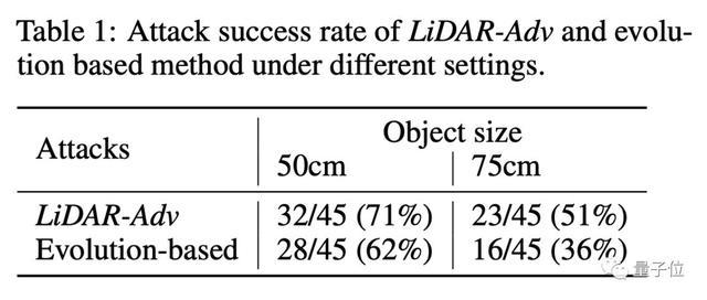 在大小为50厘米的物体上,LiDAR-Adv可以达到71%的攻击成功率,高于进化算法的黑盒攻击,在更大尺寸的物体上也一样。