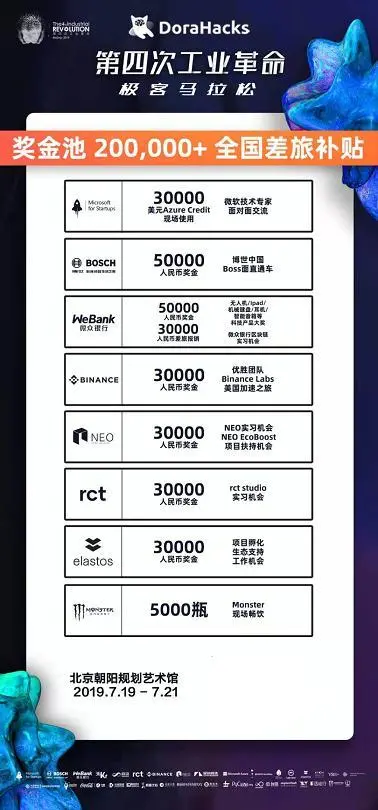 2019年7月19日至21日,“第四次工业革命” Hackathon by DoraHacks 将在北京朝阳规划艺术馆举办。36个小时中,Hacker们将在比赛中挑战自己,挑战极限,协同队友互相帮助、鼓励。