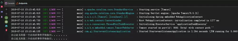 System.out.println("自己定义的第一个启动后事件开始执行。。。。。。。");