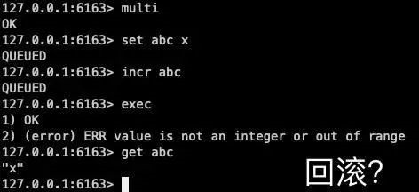 可以发现,就算中间出现了失败,set abc x 这个操作也已经被执行了,并没有进行回滚,从严格的意义上来说 Redis 并不具备原子性。