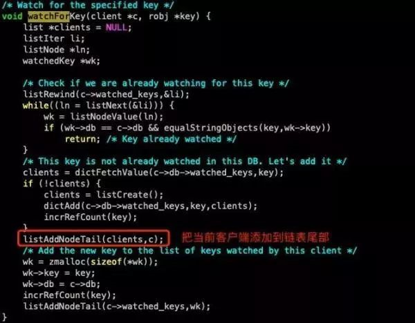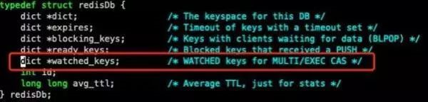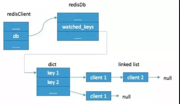 RedisDb 存放了一个 watched_keys 的 Dcit 结构,每个被 Watch 的 Key 的值是一个链表结构,存放的是一组 Redis 客户端标志。