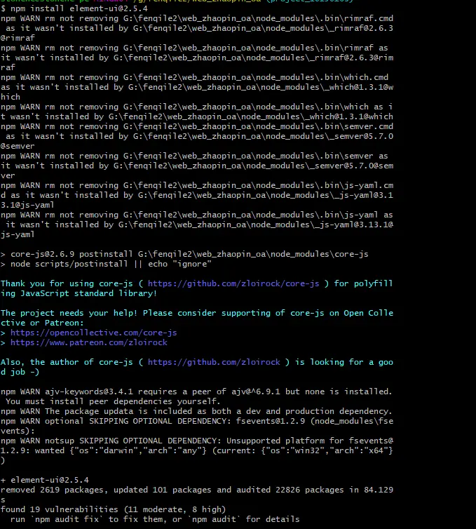 接下来,我改变思路,使用npm install element-ui@2.5.4做尝试,成功了,这原因让人琢磨不透。npm 和 cpnm 同父异母的兄弟,居然不一样,如果有小伙伴知道其中的原因,可以告诉我。