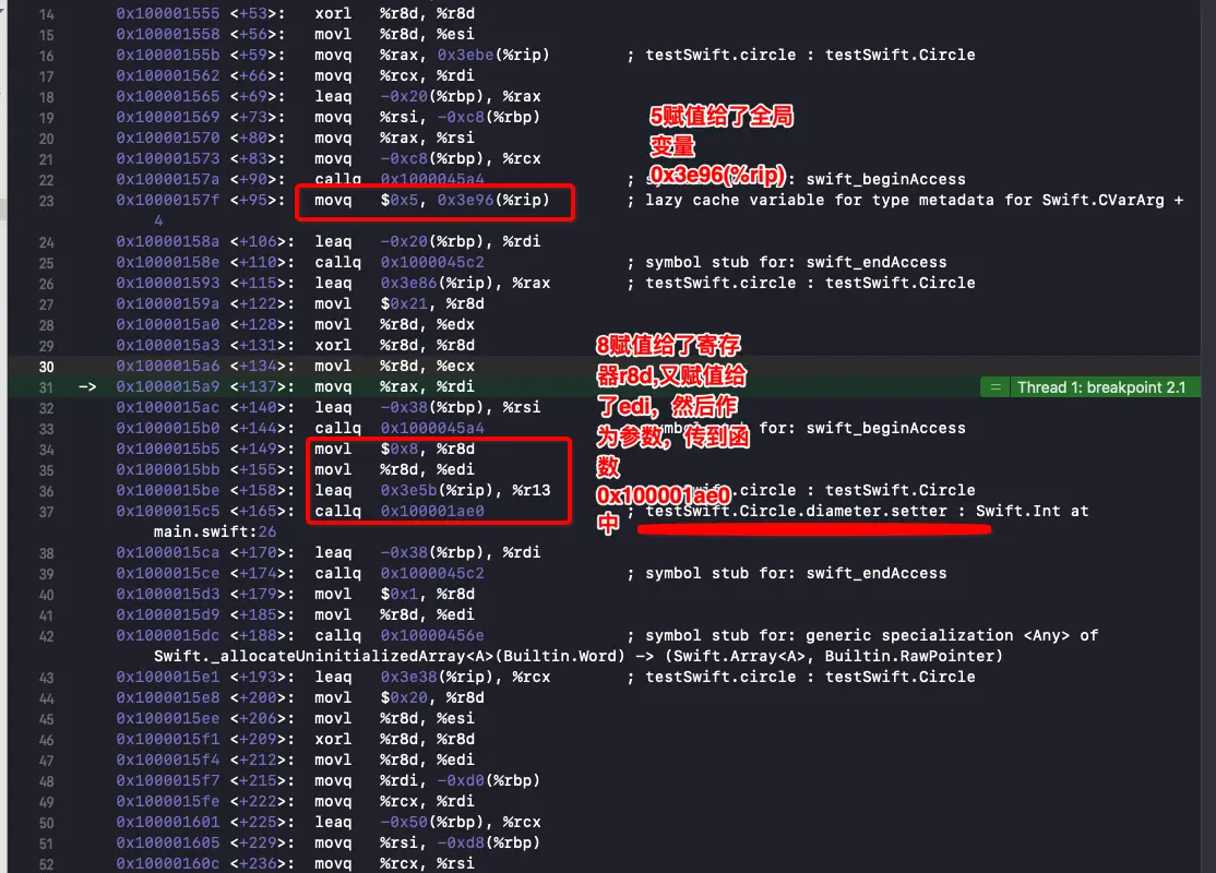 %r8d,又给寄存器%edi,作为参数调用函数0x100001ae0的时候传入,而函数0x100001ae0就是testSwift.Circle.diameter.setter这就是存储属性和计算属性的区别