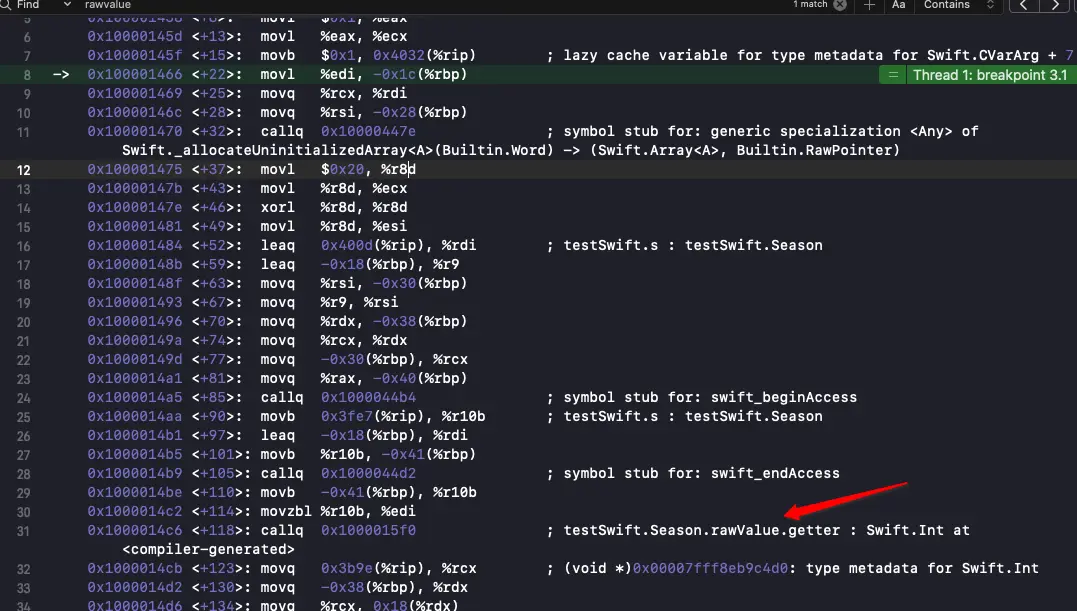 上面代码输出为12,这样就完成了获取枚举的原始值的时候,直接获取的是只读计算属性。光看结果是不够令人信服的,那就看汇编