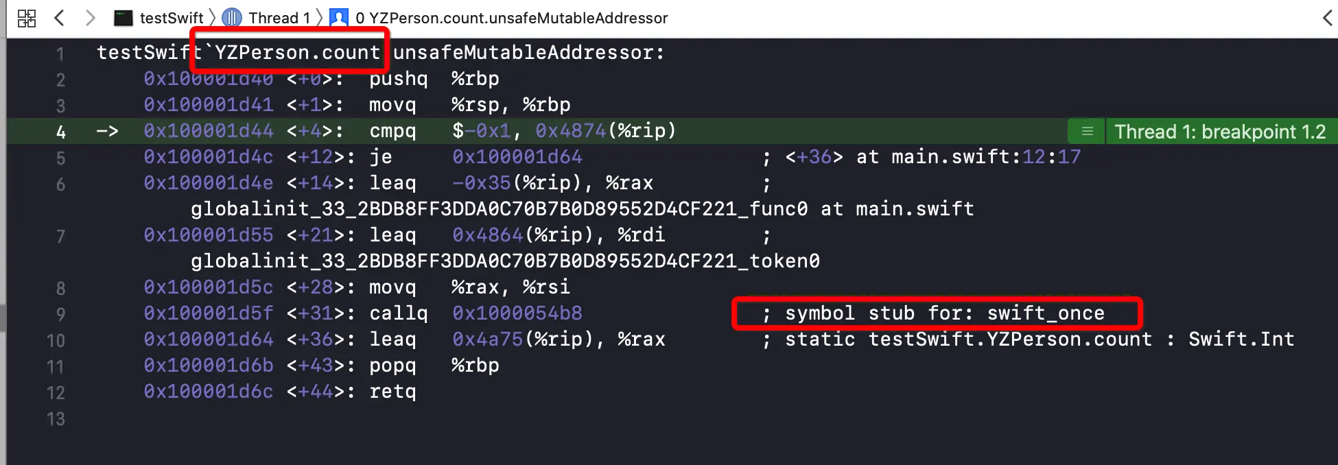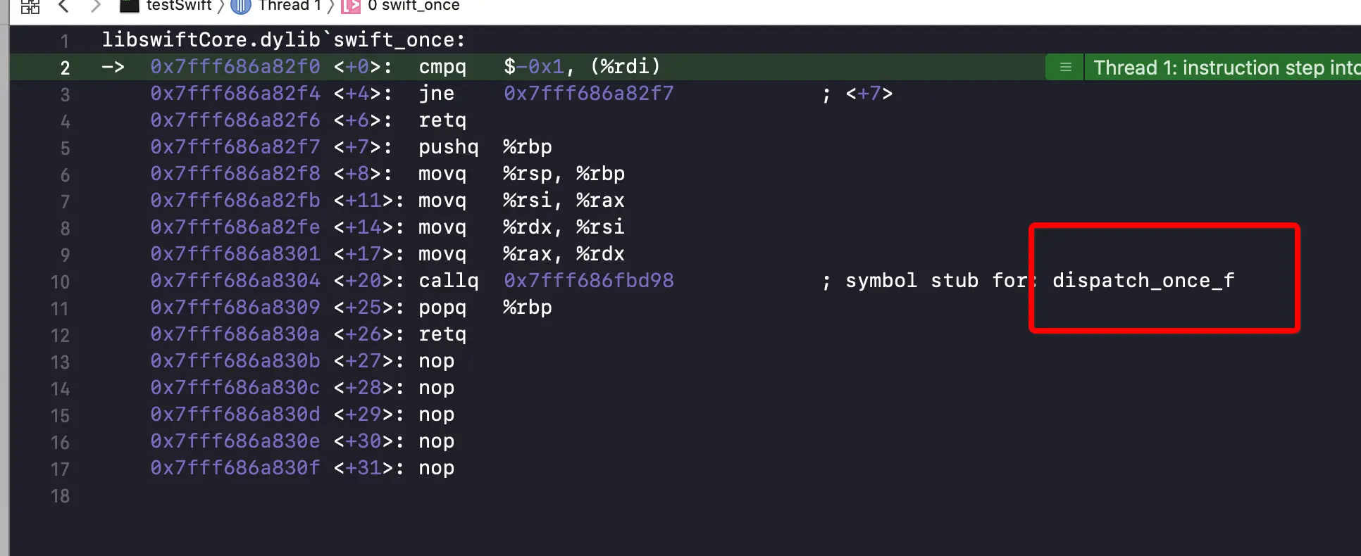 如下图所示,可以看出,会调用 swift_once函数,来到这个调用位置,si汇编调试指令,一直跟进去