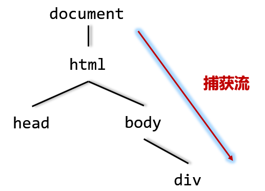 与冒泡流相反,事件捕获的思想是从DOM树的最上方传到触发事件的节点本身,也就是从较为不具体的元素传向具体的元素传播,也可以说从父元素向子元素传播。