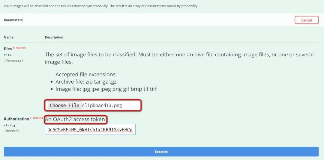 再将之前通过clientid和client secret换取的access token填到控制台对应字段里,点击execute: