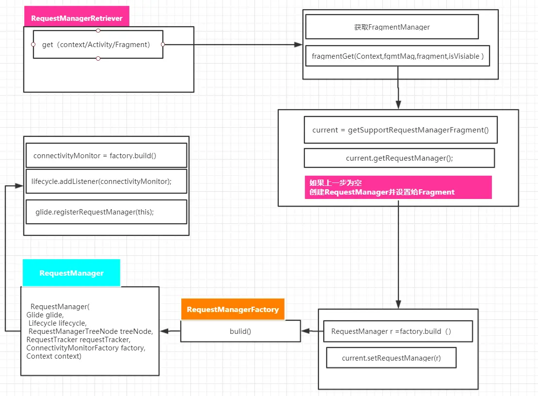- 在RequestManagerRetriever中获取到RequestManager是通过一系列的get()重载方法,get()方法的参数可以是Fragment、SupportFragment、Activity、SupportActivity、View或者Context。最终的目的都是尽可能通过这些组件中获取出FragmentManager。以参数为Activity为例代码如下:
