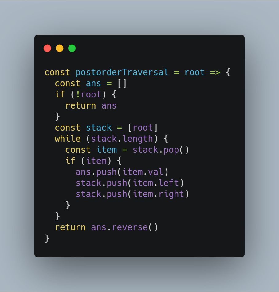 本道题目采用迭代实现 DFS 不太容易理解,主要由于迭代不能像递归那样向上回溯,所以迭代向下遍历的过程中,无法保证根节点最后访问。