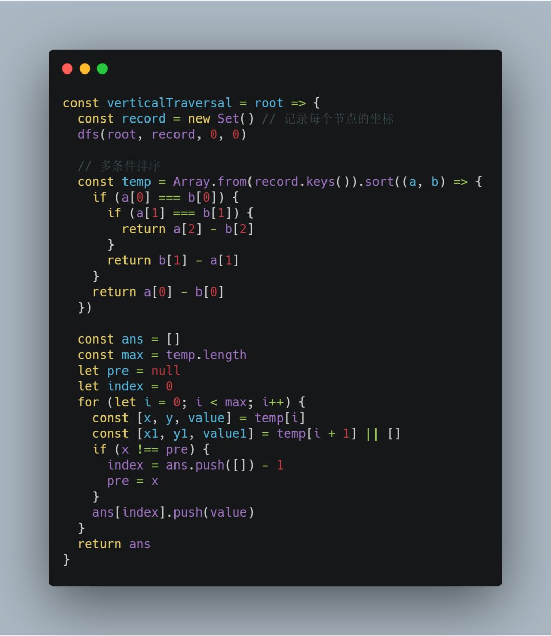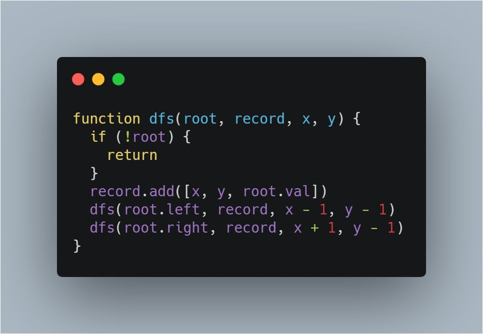 这道题目要求我们求出垂序遍历序列,那么首先还是得先遍历二叉树,这里采用递归实现 DFS 来遍历二叉树。