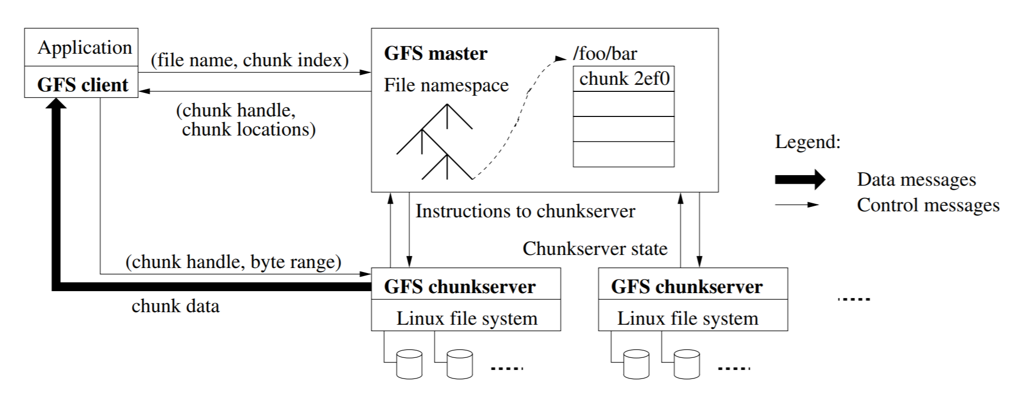 GFS的集群由一个主服务器(master)和多个块服务器(chunkserver)构成。每个文件由文件块组成,文件块采用64位的块句柄进行唯一标识,原文中文件块大小为64MB,不过这是16年前的系统,现在64MB显得就太小了。