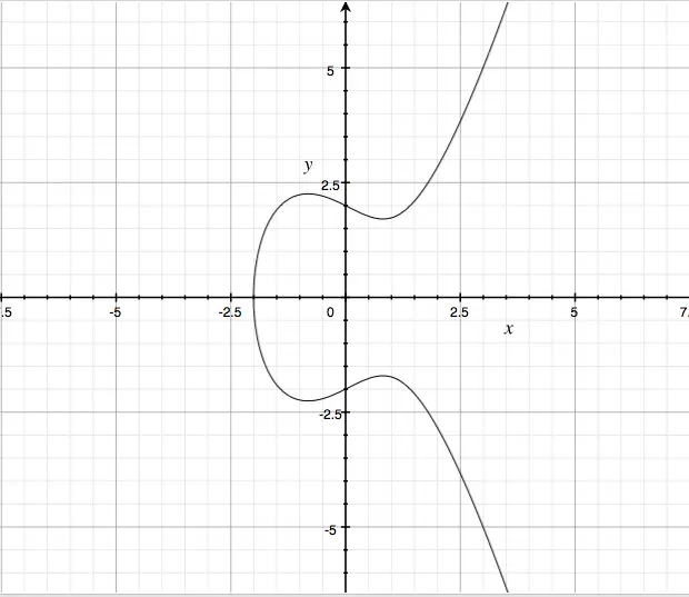 E:y^2=ax^3+bx^2+cx+d 例如,当a=1,b=0,c=-2,d=4时,所得到的椭圆曲线为: